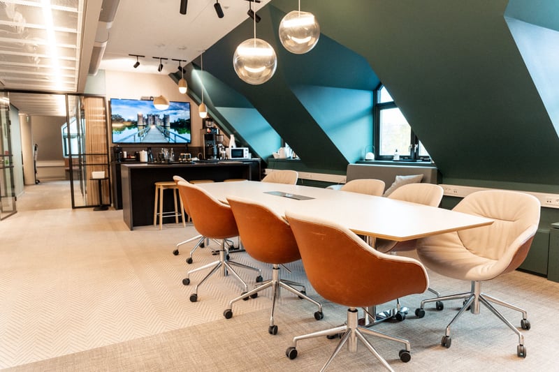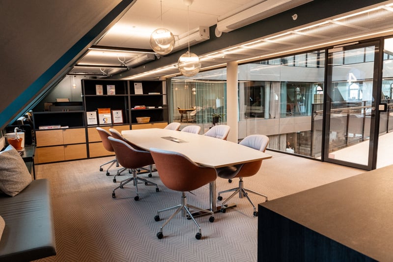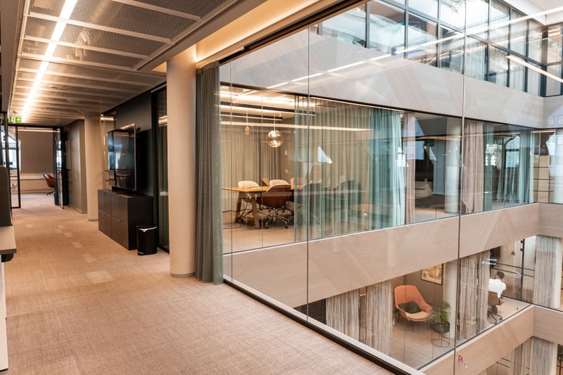 Lyse møterom mot atrium og arbeidsplasser mot fasade
