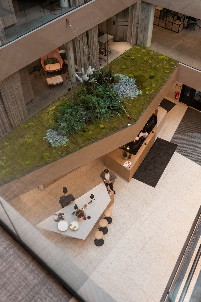 Ned mot 1. etasje hvor du har resepsjon, kaffebar, bedriftsrestaurant og lounge