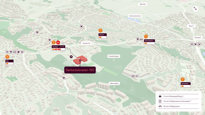 Sørkedalsveien 150 er en veletablert kontoreiendom med en sentral beliggenhet i Oslo. Eiendommen består av et markant kontorbygg på totalt cirka 21 400 kvadratmeter, oppført i 1967. Beliggenheten gir enkel adkomst og god profilering langs en av bydelens hovedfartsårer. Det er gode kollektivforbindelser i umiddelbar nærhet, med nærmeste bussholdeplass omtrent 450 meter unna og Hovseter T-banestasjon innenfor en gangavstand på cirka 600 meter. Dette gjør eiendommen lett tilgjengelig for ansatte og besøkende.