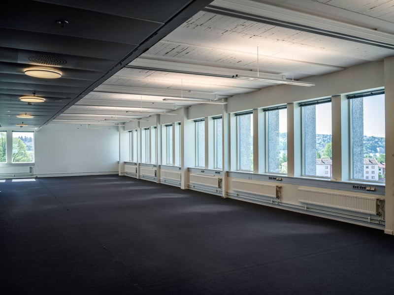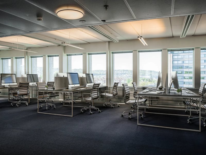 Store vindusflater og gode lysforhold. De ledige lokalene er møblert ved hjelp av KI for å vise mulighetsrommet ved innredning og valg av arbeidsplasskonsept.