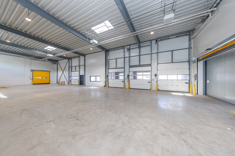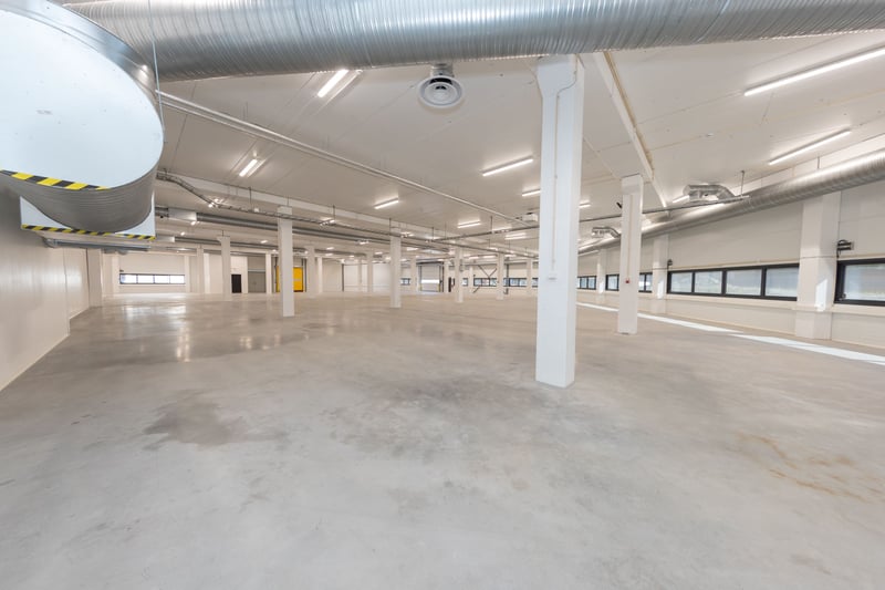I 1.etg er det et varemottak med port med flush overgang, i tillegg til to stk kjøreramper.