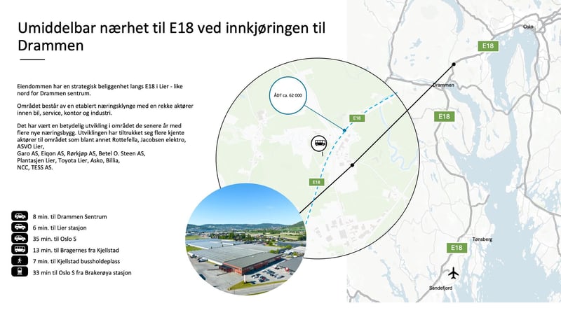 Eiendommen på Sankt Hallvards vei 12, 3414 Lierstranda er et næringsbygg tilrettelagt for kontorvirksomhet. Bygningen er lokalisert i et etablert næringsområde på Lierstranda, som er preget av næringsvirksomhet, lager og handel. Bygningen er løpende vedlikeholdt, og fellesarealer samt tekniske installasjoner har gjennomgått oppgraderinger. Kontorlokalene har store vindusflater, noe som gir tilgang på naturlig dagslys. Lokalene kan tilpasses ulike leietakerbehov. Eiendommen tilbyr felles kantinefasiliteter, møterom og garderober med dusj. Det er tilgang til parkeringsplasser for bil og sykkel. I nærområdet finnes et utvalg av service- og serveringstilbud. Området har god tilknytning til større veier, med enkel adkomst til E18. Dette gir videre forbindelse til Drammen sentrum og øvrige destinasjoner. Kollektivtilbudet inkluderer bussholdeplasser i umiddelbar nærhet, med ruter som knytter området til Drammen sentrum. Eiendommen har implementert bærekraftige tiltak som LED-belysning i fellesarealer og systemer for avfallssortering. Eiendommen har energimerking D.