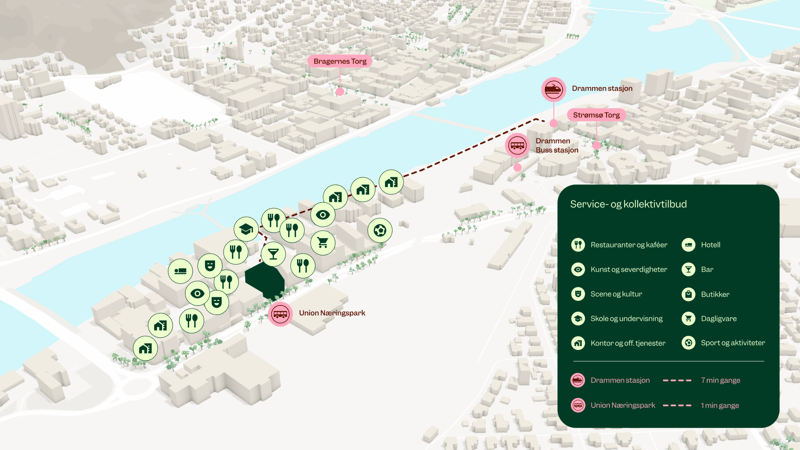 Grønland 51–53 er en moderne kontoreiendom med en sentral beliggenhet på Union Brygge i Drammen. Eiendommen består av to kontorbygg med et samlet bruksareal på rundt 27 000 kvadratmeter. Det nyeste bygget ble ferdigstilt i 2015, noe som sikrer høy standard og tidsriktige løsninger for leietakere. Plasseringen i et av byens mest dynamiske næringsområder gir umiddelbar nærhet til et bredt spekter av servicetilbud, kafeer og restauranter. Kommunikasjonsmulighetene er utmerkede, med busstopp bare 50 meter unna og Drammen stasjon med sitt omfattende tog- og busstilbud innenfor en avstand på rundt 800 meter. Dette gjør eiendommen til et strategisk godt valg for bedrifter som verdsetter en sentral, moderne og lett tilgjengelig arbeidsplass.