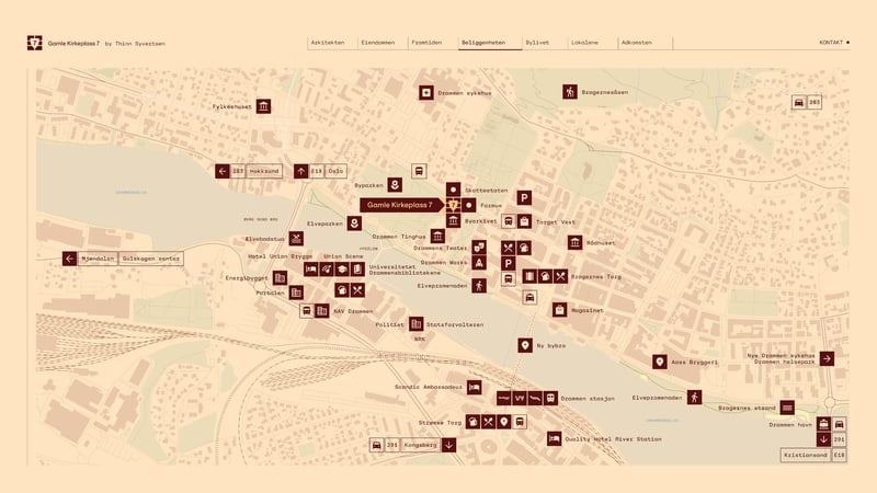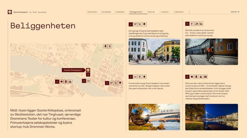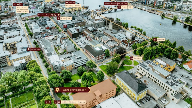 Gamle Kirkeplass 7 er en historisk og representativ eiendom med en førsteklasses beliggenhet i hjertet av Drammen. Eiendommen, som tidligere huset byens rådhus, er et markant kontorbygg oppført i 1939 med et samlet bruksareal på rundt 2250 kvadratmeter. Beliggenheten ved Bragernes Torg gir umiddelbar nærhet til byens pulserende liv, med et bredt utvalg av butikker, spisesteder og kulturtilbud rett utenfor døren. Samtidig gir plasseringen ved den parkmessige Kirkeplassen en unik kombinasjon av sentralitet og rolige omgivelser. Kollektivtilbudet er utmerket, med bussholdeplass kun 200 meter unna. Drammen stasjon, et sentralt knutepunkt for både tog og flytog, kan nås på en kort spasertur på rundt 950 meter.