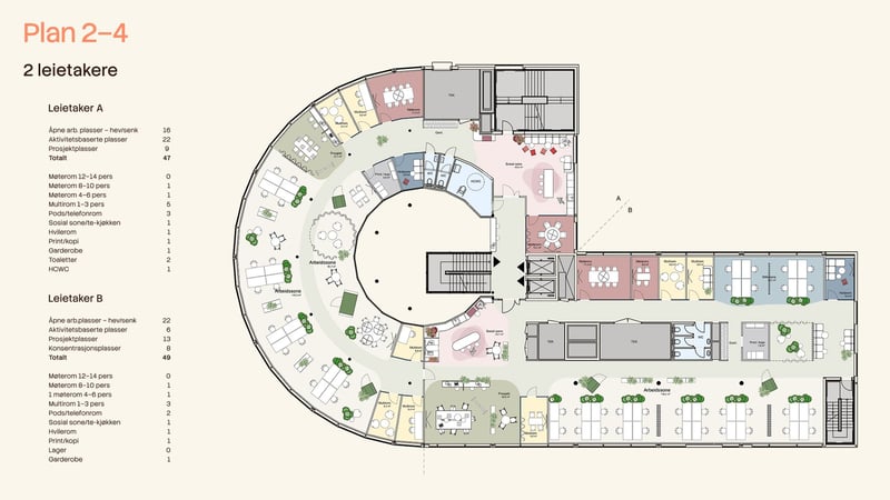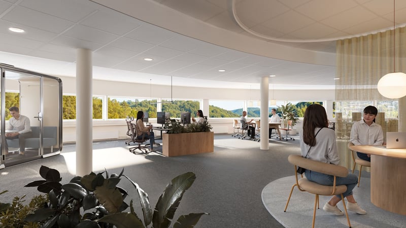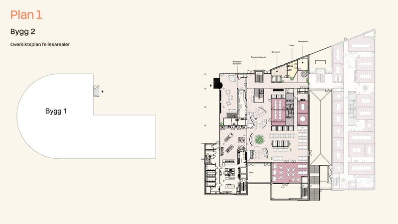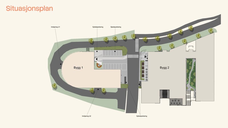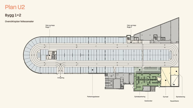 Fasiliteter inkluderer felles resepsjon, møterom og kantine. Parkering er tilgjengelig, med lademuligheter for elbiler. Sykkelparkering og garderober med dusj er også på eiendommen.